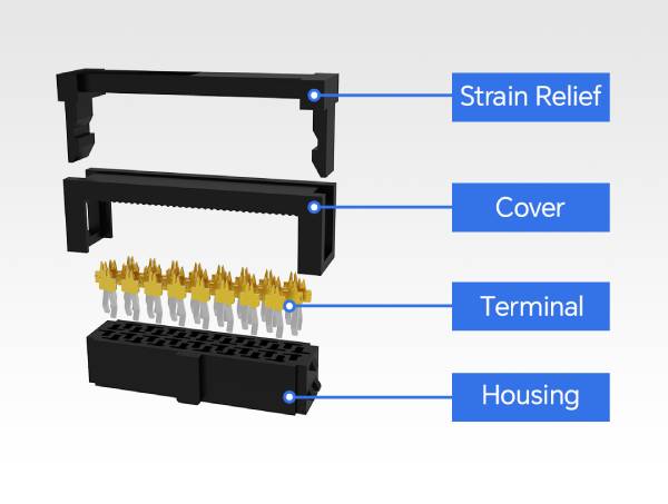 IDC W/O Strain Reli,其中公端和母端使用 IDC 技術直接連接,支持 AWG 28-22 的線規,將裝配效率提高 30%。